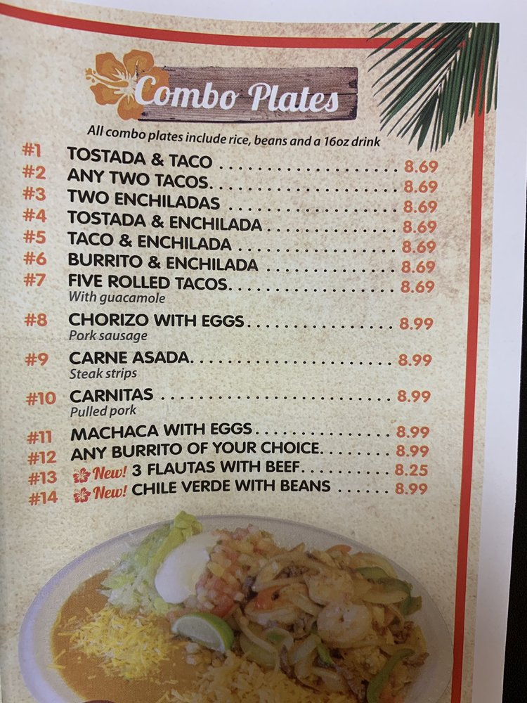 Any taco and enchilada served with rice, beans, lettuce, guacamole, sour cream, pico de gallo.